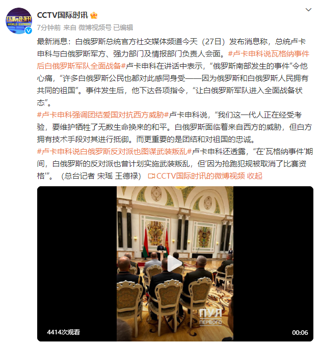 卢卡申科透露,“在‘瓦格纳事件’期间,白俄罗斯的反对派也曾计划实施武装叛乱,但‘因为抢跑犯规被取消了比赛资格’”。(总台记者 宋瑶 王德禄)