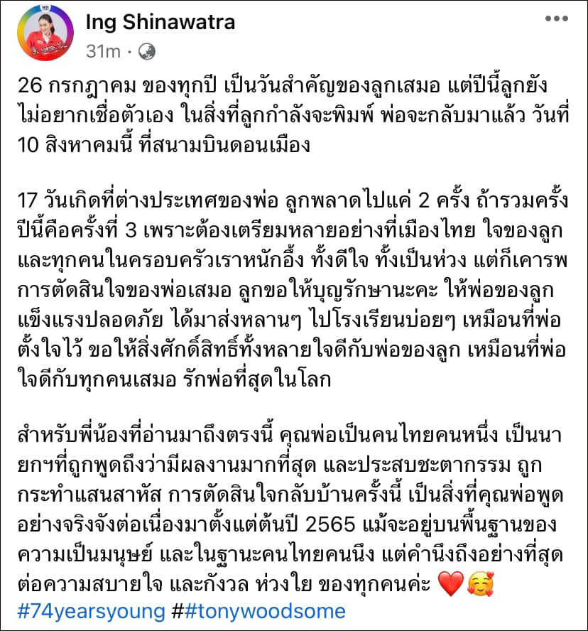 观察者网讯 7月26日,泰国主要反对党为泰党领袖、前总理他信的女儿贝东丹在社交媒体发文称,她的父亲、泰国前总理他信在流亡海外15年后,将于8月10日返回泰国。