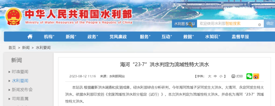 8月12日,国家水利部发消息称,根据最新洪水调查和实测成果,经水利部综合分析研判,今年海河流域子牙河发生大洪水,大清河、永定河发生特大洪水。依据相关规定,本次洪水判定为流域性特大洪水,并命名为海河“23•7”流域性特大洪水。