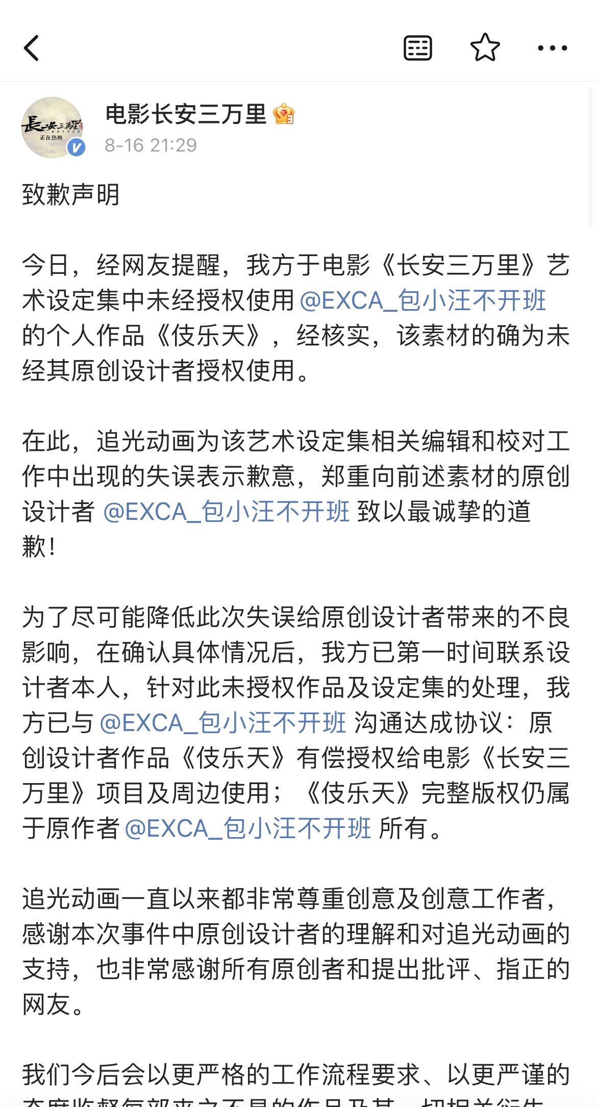 声明中,追光动画为该艺术设定集相关编辑和校对工作中出现的失误表示歉意,郑重向前述素材的原创设计者“EXCA_包小汪不开班”致以最诚挚的道歉。