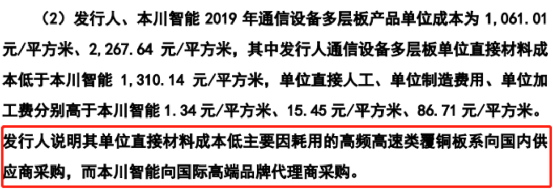 在此前公告中,龙腾电子解释其通信设备多层板产品2019年单位成本远低于本川智能,是因为其直接材料成本低于后者,并进一步表示,其耗用的高频高速类覆铜板系向国内供应商采购,而本川智能向国际高端品牌代理商采购。