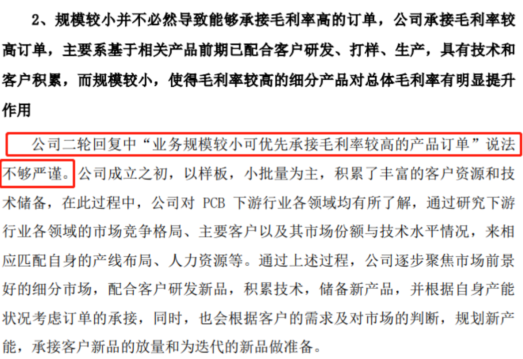 其表示,“业务规模较小可优先承接毛利率较高的产品订单”说法不够严谨,并表示,公司承接毛利率较高订单,主要系基于相关产品前期已配合客户研发、打样、生产,具有技术和客户积累,而规模较小,使得毛利率较高的细分产品对总体毛利率有明显提升作用。