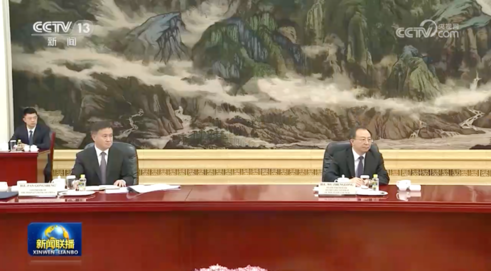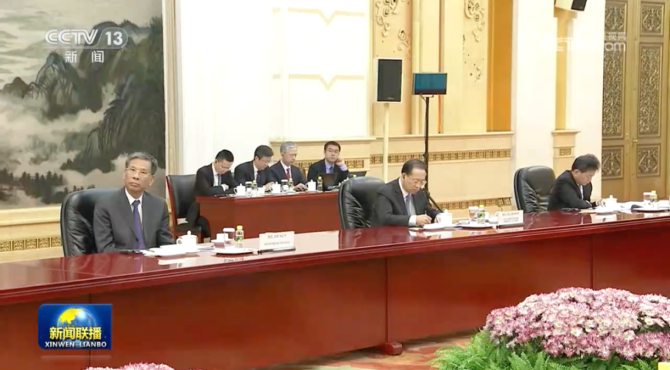 画面显示,参加这次会见的还有国务委员兼国务院秘书长吴政隆,财政部部长刘昆,中国人民银行党委书记、行长,国家外汇局党组书记、局长潘功胜等。