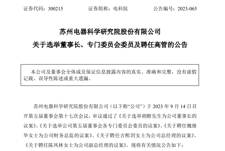 首先就是他重新当选电科院董事长。电科院公告显示,鉴于公司多位董事及董事长宋静波辞职,公司已于9月12日召开2023年第一次临时股东大会选举出新任各位董事,公司现阶段经营急需回归正轨,现选举胡醇担任公司董事长,任期自本次董事会通过之日起至第五届董事会任期届满为止。