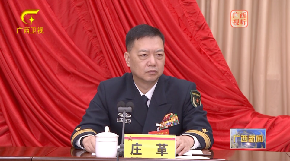 《广西新闻》报道画面显示,在1月25日召开的广西军区党委十三届二次全体(扩大)会议上,庄革身着海军军服在主席台就座。
