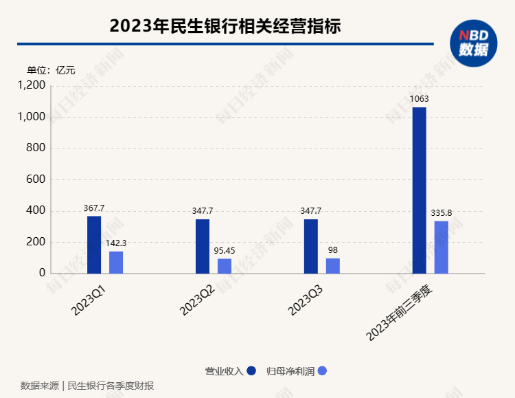 记者注意到,目前民生银行暂未公布2023年年报。截至去年三季度末,民生银行资产总额7.52万亿元,发放贷款和垫款总额4.38万亿元。同期,该行实现归属于该行股东的净利润335.77亿元,同比下降0.60%;实现营业收入1063.04亿元,同比下降2.11%。