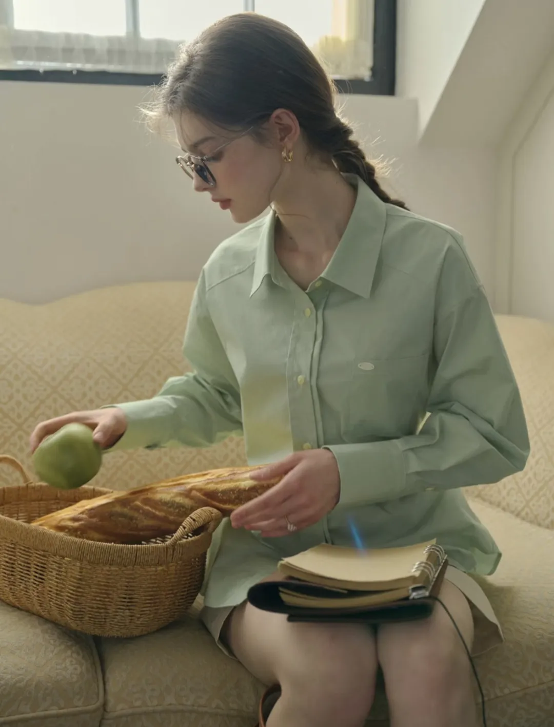 早春带着丝丝凉意,一件薄荷曼波绿的丝感衬衫搭配垂感白色阔腿裤,淡淡的绿色代表着新鲜与生机,通勤休闲都能穿。