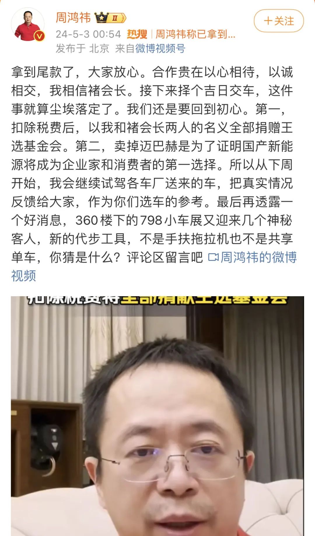 凌晨,周鸿祎回应:拿到迈巴赫尾款!择日交接,钱全部捐出!