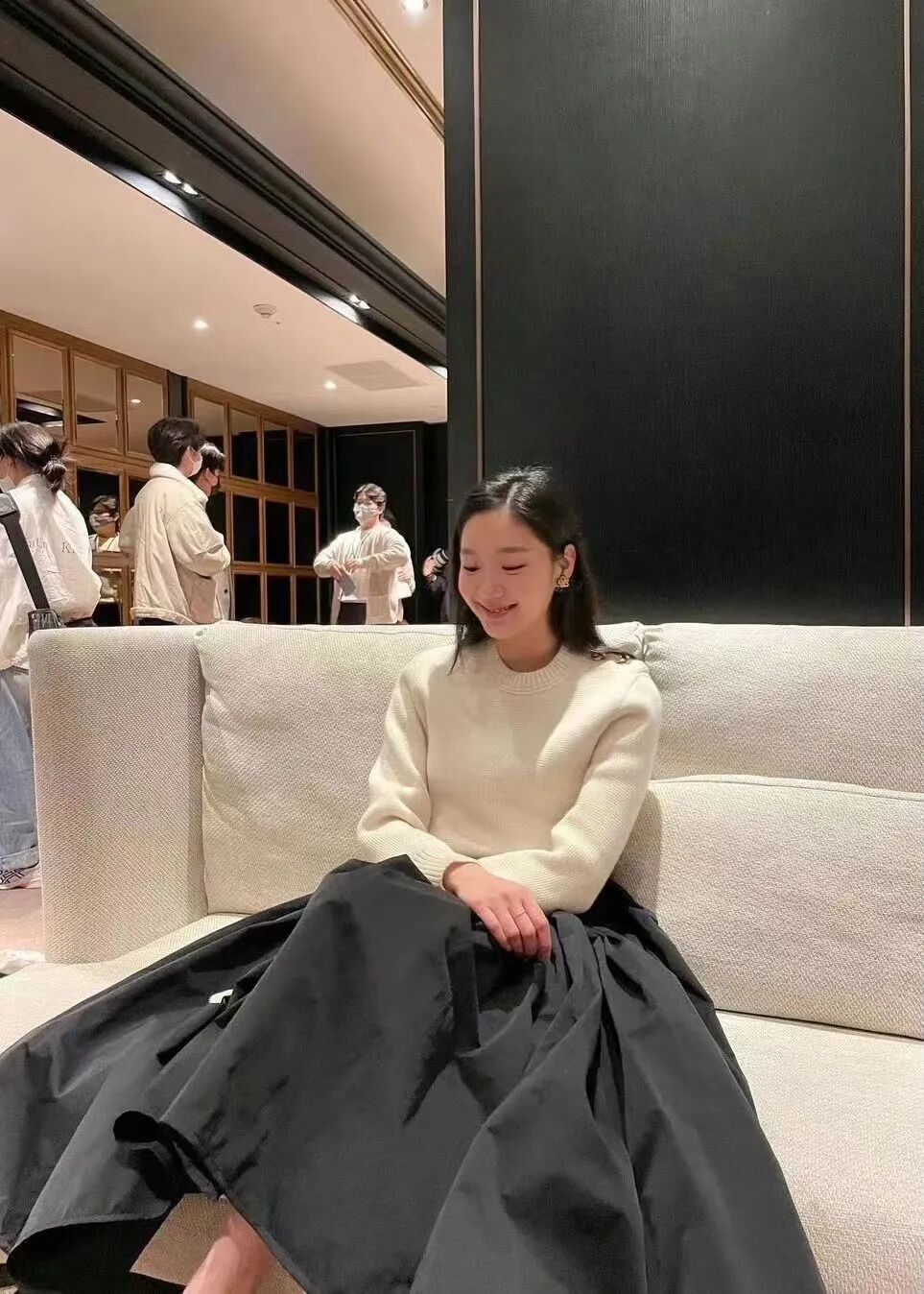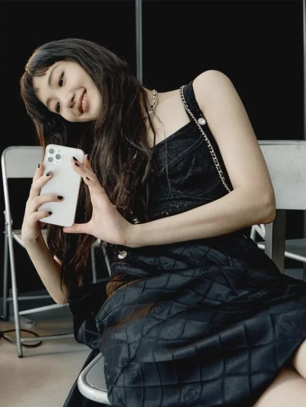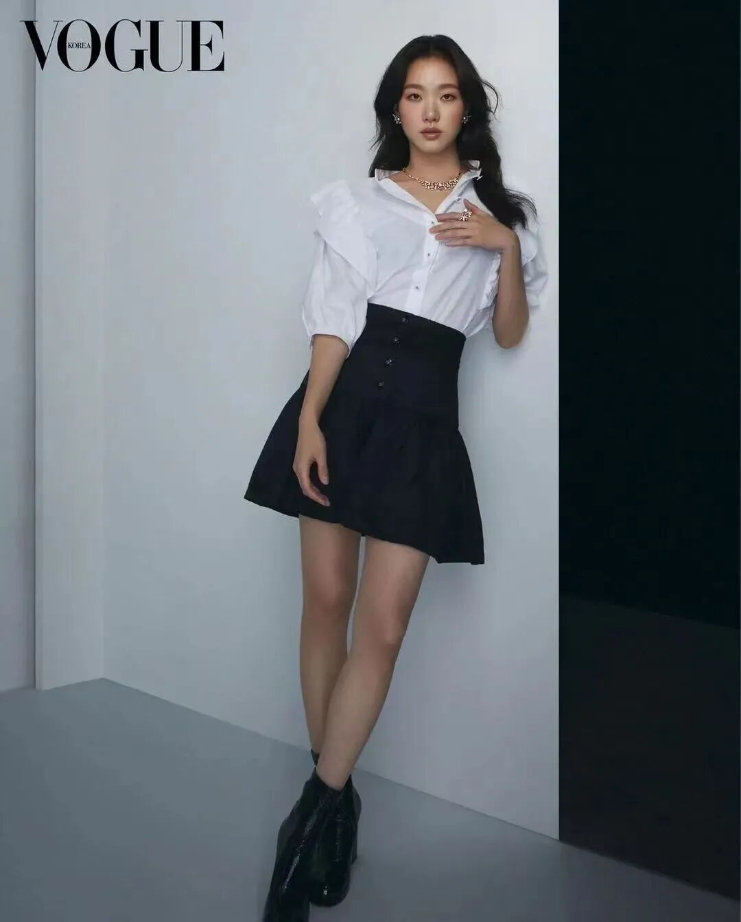 她在去年登上韩国版《VOGUE》时一身简约黑白穿搭,白色的木耳边衬衫搭配黑色A字伞裙,让黑白配的衬衫短裙没有那么职业性,更显得俏皮休闲。