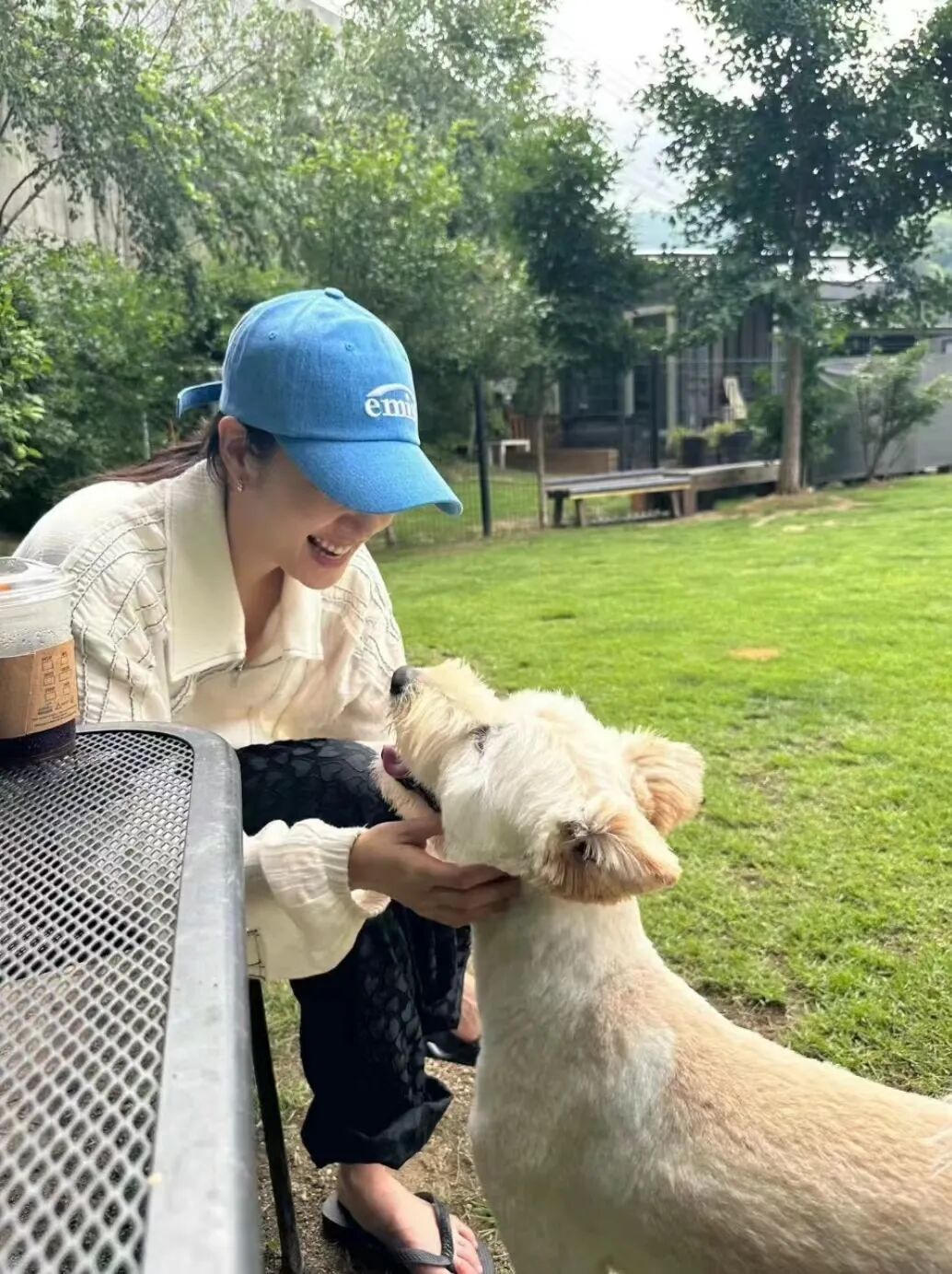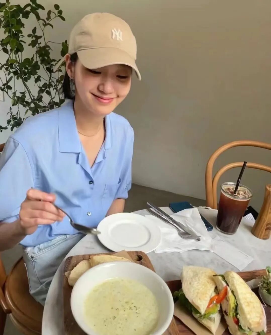 在她日常晒出来的照片中能感受到如春风拂面般的自如,自带慵懒氛围感。蓝色V领衬衫搭配驼色棒球帽,韩系范十足,也满满的慵懒感。