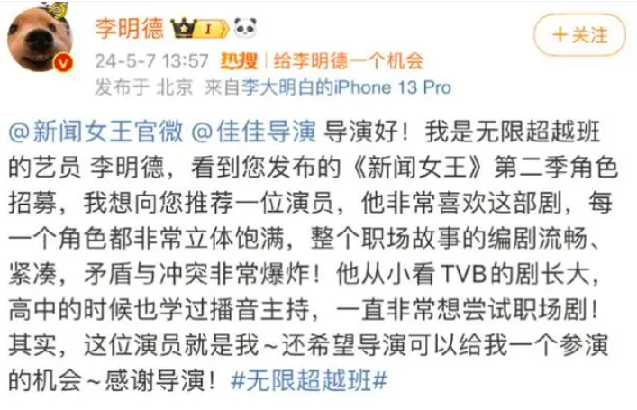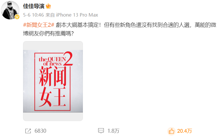 国民热度居高不下的TVB剧集《新闻女王》自收官以来,围绕续集《新闻女王2》的讨论在各大社交平台持续升温。2024年5月,导演钟澍佳在微博发布了一则演员求推荐消息,更是开启娱乐圈的大型“求职”名场面,艺人们纷纷投来“橄榄枝”自荐出演。