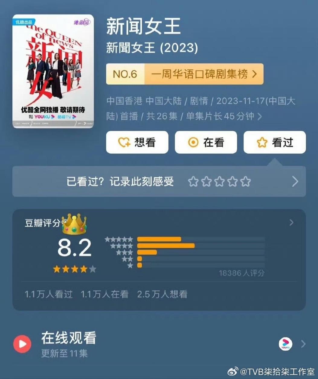 “人咬狗的世界不适合你,找个男人嫁了吧!”多少人因为《新闻女王》中的这句犀利台词而重新爱上港剧。除却港剧怀旧老粉之外,许多此前并不关注TVB电视剧的一批观众也产生了追剧兴趣。该剧在开播后收视率一路飘红,仅用了四天时间就在豆瓣平台得到8.2的高分。