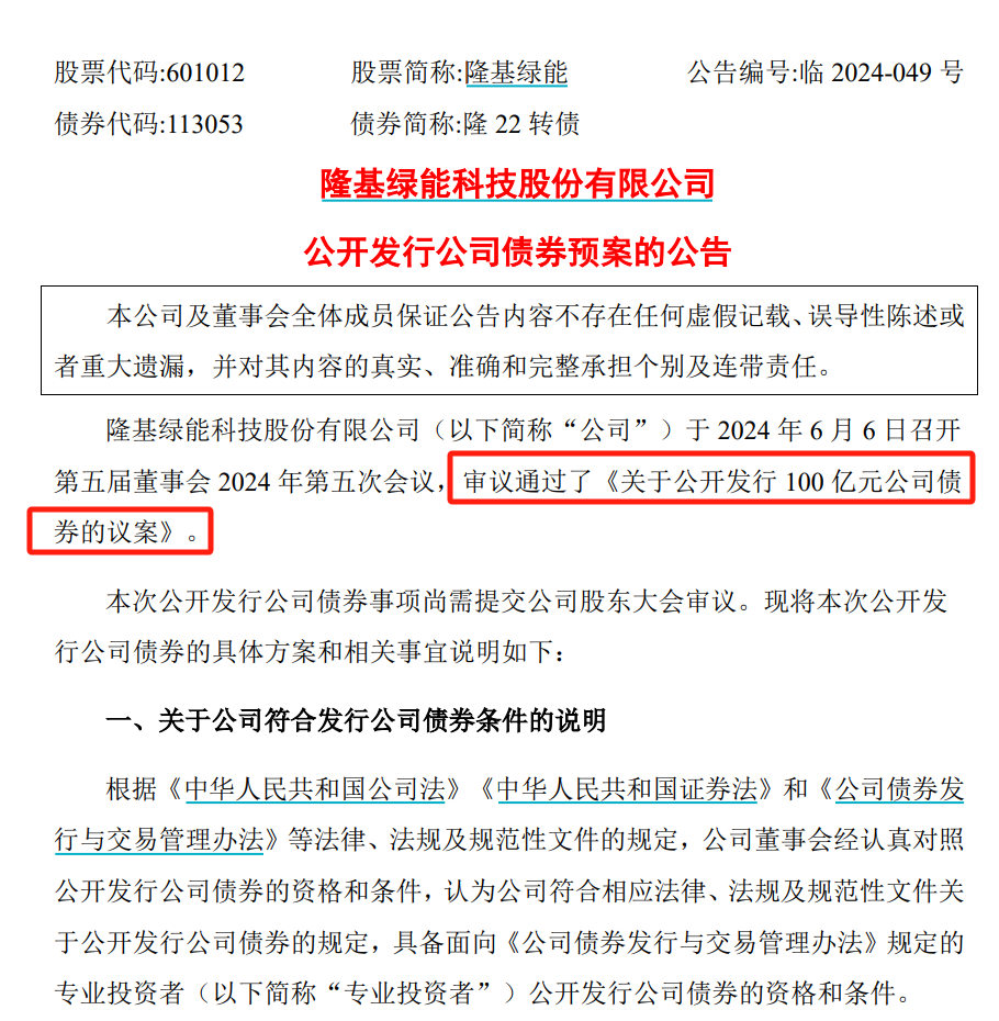 隆基绿能(601012)6月6日晚间公告,公司拟公开发行不超过100亿元(含)公司债券,募集资金主要用于满足公司经营需要、补充流动资金、偿还有息负债、支持项目建设及运营、权益出资及适用的法律法规允许的其他用途。