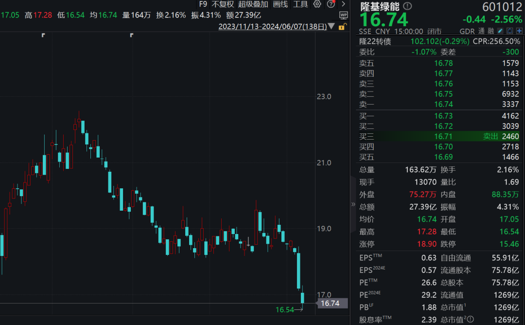 在此背景下,近期,市场上多个与隆基绿能(601012)相关的传闻开始发酵。6月7日盘中,隆基绿能股价一度跌超3%,当日收盘报于16.74元/股,跌幅收窄至2.56%。