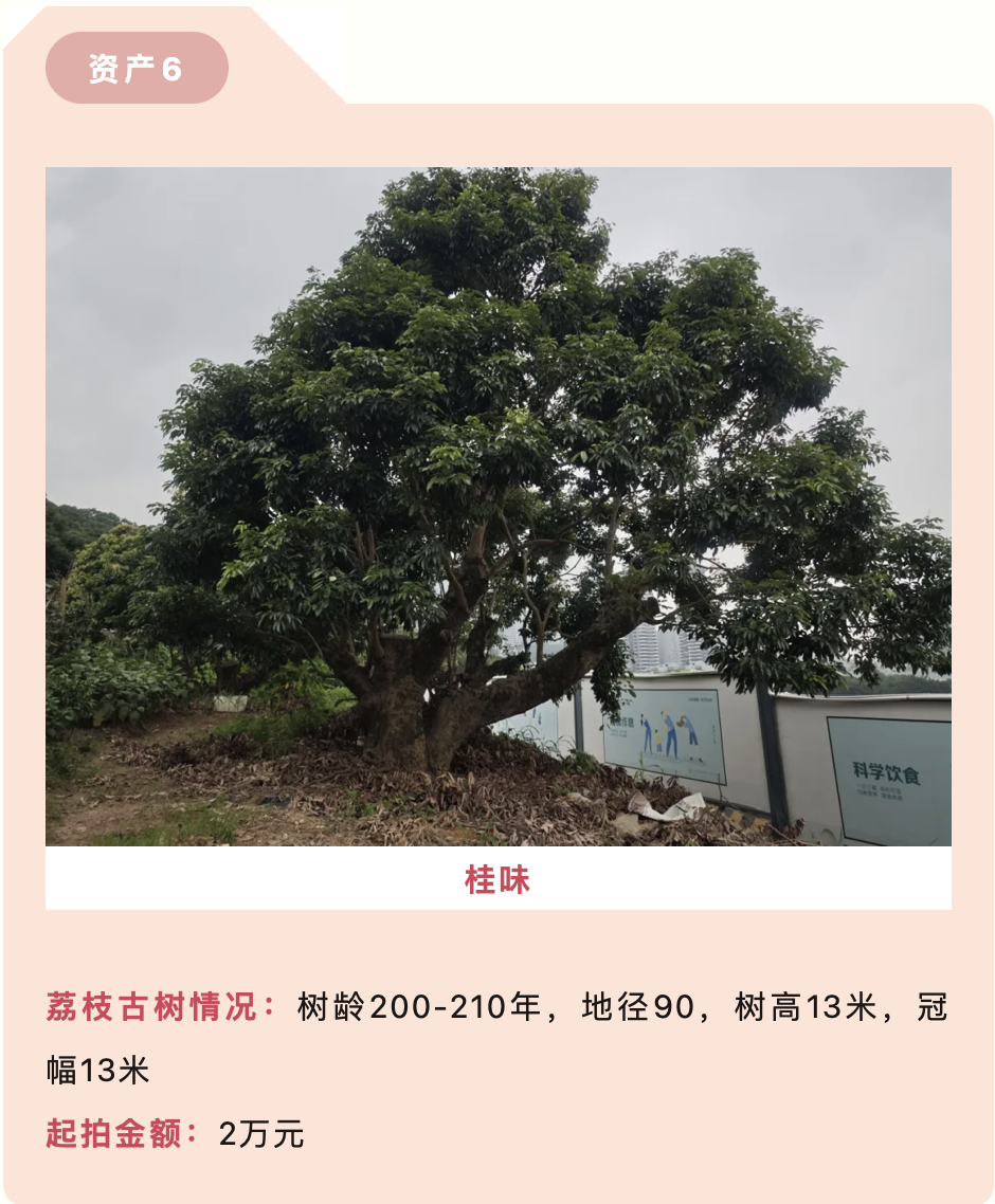 此外,当地还为荔枝古树品牌守护项目招商,价格为2000元/棵/年(3年合计6000元/棵),总共有58棵,都为百年以上荔枝树,成交方享有标的古树冠名权,可为古树命名。招商方为标的古树统一制作标牌,成交方可体验为荔枝古树施肥、浇水、除草、收获等。