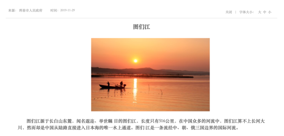 据珲春市政府官网介绍,图们江源于长白山东麓,长度516公里,在中国众多的河流中,图们江算不上长河大川,然而却是中国从陆路直接进入日本海的唯一水上通道。图们江是一条流经中、朝、俄三国边界的国际河流。