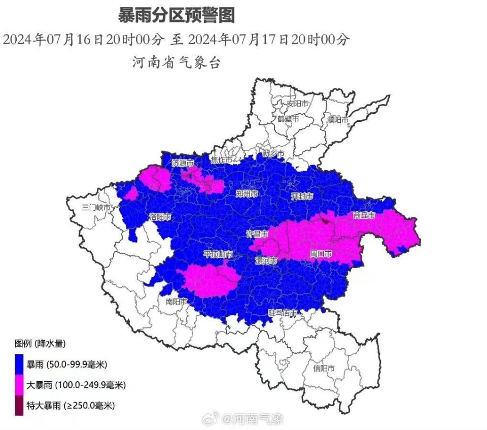 “河南气象”称,7月15日到7月16日晨,全国最强的降雨出现在河南。其中南阳东北部、周口北部、许昌南部特大暴雨。