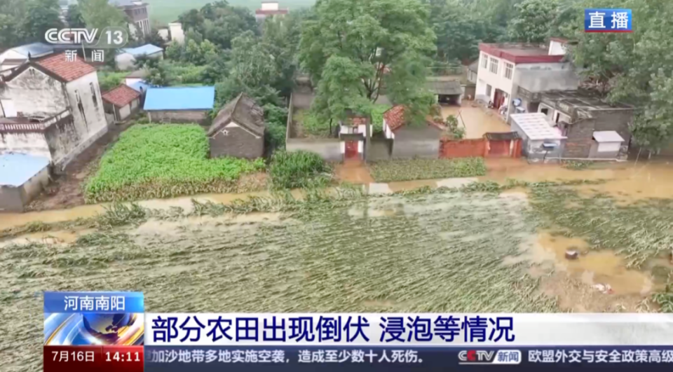央视报道称,南阳农田有受灾的情况,玉米出现了倒伏的情况。农田里有不少积水,玉米、花生等作物还浸泡在水中。具体受灾农田面积还在进一步统计当中。