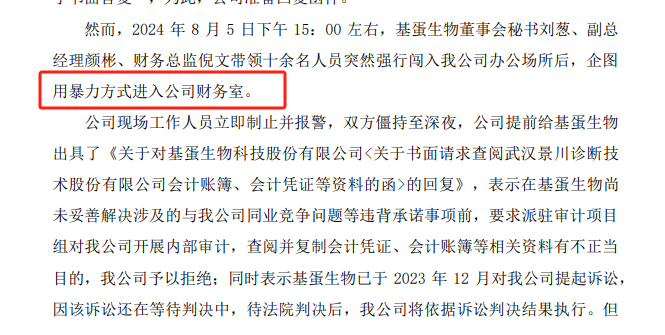 今年8月,景川诊断发布关于公司暂停生产经营活动的公告,直指基蛋生物于8月5日指派人员强闯公司,干扰公司正常生产经营,导致公司员工无法安心工作,公司现已暂停生产。根据公告,8月5日下午15点左右,基蛋生物相关高管带领十余名人员突然强行闯入景川诊断办公场所,企图用暴力方式进入财务室。景川诊断现场工作人员立即制止并报警,双方僵持至深夜。