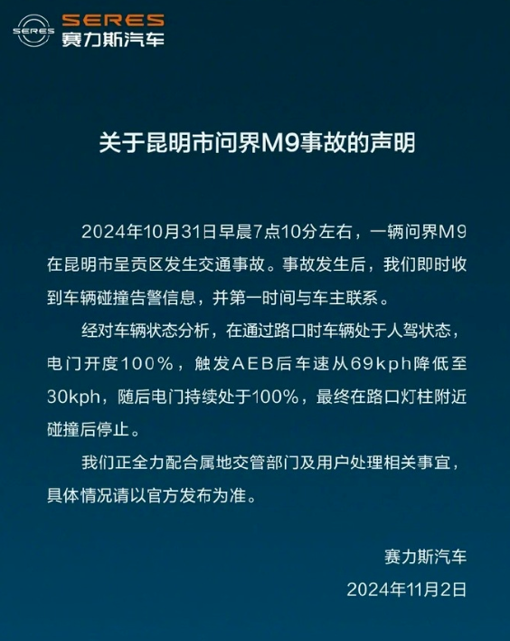 声明指出,2024年10月31日早晨7点10分左右,一辆问界M9在昆明市呈贡区发生交通事故。事故发生后,即时收到车辆碰撞告警信息,并第一时间与车主联系。