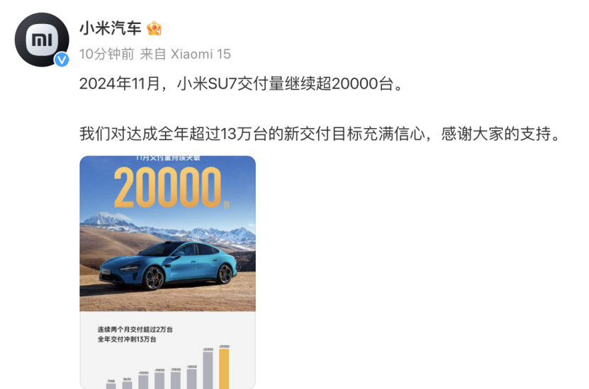 据小米汽车官方微博发布的消息,2024年11月,小米SU7交付量继续超2万辆,连续两个月交付超过2万辆,全年交付冲刺13万辆。