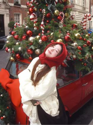 拍照出片不仅靠pose,一些出片的氛围感神器也必不可少,圣诞元素的麋鹿发箍,跟后面的圣诞树相称,复古的环境与复古的穿搭犹如置身千禧年的美国圣诞节。当然帽子也是出片秘诀之一,一顶圣诞气息浓厚的红色帽子让画面的视觉中心更加明显,亮度也有了显著提升。
