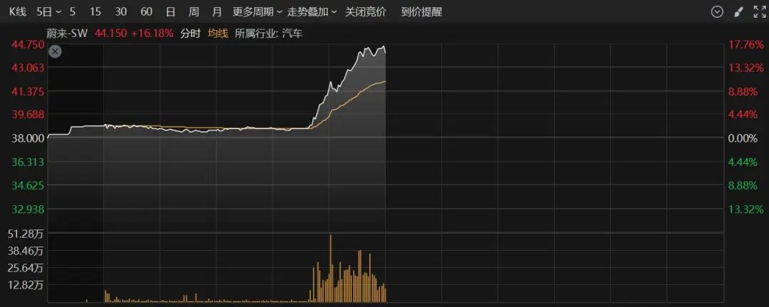 受此消息影响,3月18日当天,蔚来港股快速拉升,盘中一度涨幅超17%,截至午盘收盘,涨超16%。