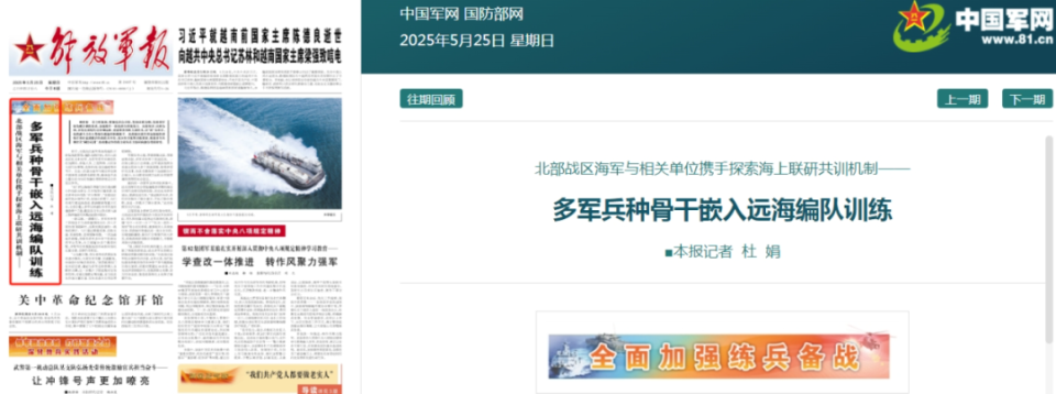 5月25日,《解放军报》头版刊文披露,北部战区海军与相关单位携手探索海上联研共训机制,多军兵种骨干嵌入远海编队训练。