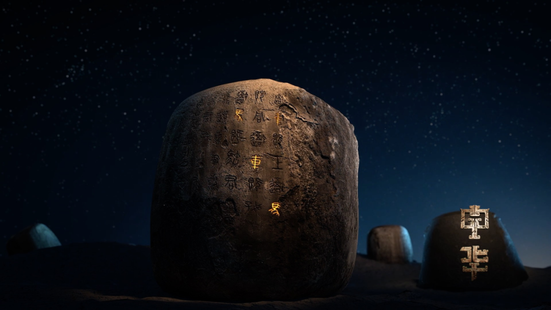 十面青黑色石鼓,每面都刻诗一首,“马”“车”二字反复出现。秦人的大篆字体方正遒劲,像刀砍斧削;黑色对应水德,有着冷酷扩张的意味。