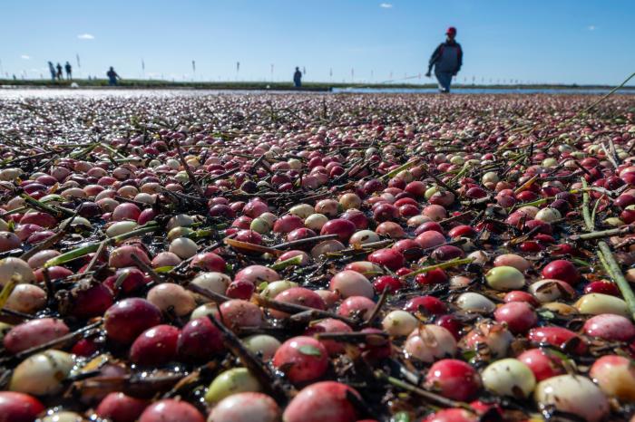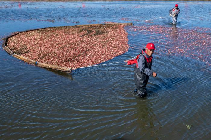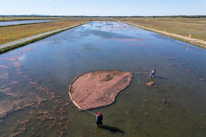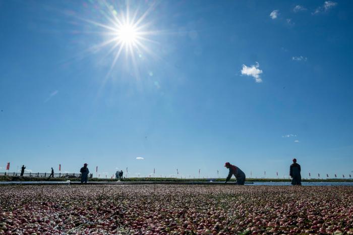 近年来,抚远市聚力发展蔓越莓特色产业,打造了全国主要的蔓越莓规模化种植基地,并配套建有蔓越莓研发中心、冷链仓库、加工车间等全产业链区块,带动当地农户就业增收。9月21日,在抚远市蔓越莓种植基地,工作人员在水中采收蔓越莓。