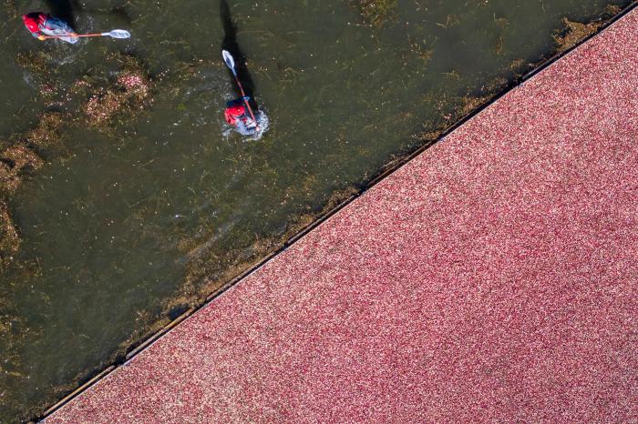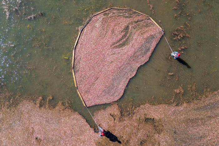 9月21日,在抚远市蔓越莓种植基地,工作人员在水中采收蔓越莓(无人机照片)。
