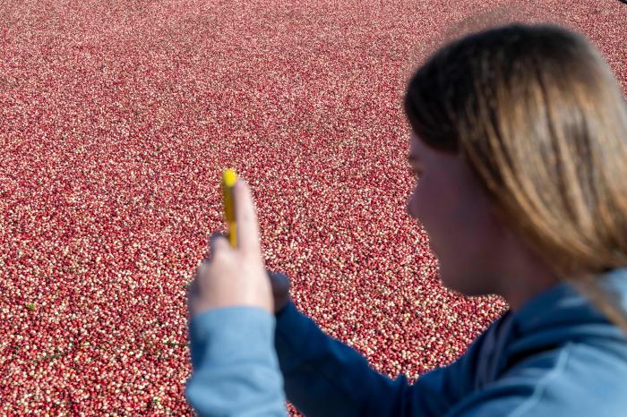 9月21日,在抚远市蔓越莓种植基地,一名俄罗斯游客在拍摄照片。