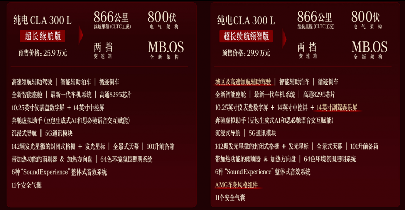 9月25日,全新梅赛德斯-奔驰纯电CLA正式启动预售,先期提供纯电CLA 300L超长续航版和纯电CLA 300L超长续航领智版,预售价格分别为25.9万元和29.9万元,上市前预订还可享受1.3万元的权益。
