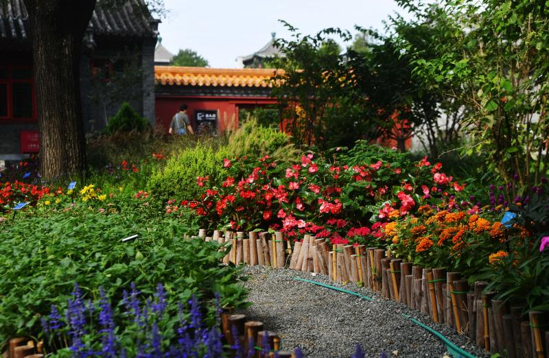 后山区域则主打“诗意自然”风格:主路东侧坡地依托原有林地风貌,设置复古镂空窗框,搭配彩叶草、千日红、香彩雀等花卉,营造出自然错落的花境景观;一对梅花鹿装饰点缀其间,与远处的万春亭及周边林木相映成趣,巧妙勾勒出“日月照京华景上更添花”的诗意画卷。科普园入口处的“静觅庭芳”花境,以红墙黄瓦为背景,以常绿彩叶植物为骨架,结合宿根与多年生花卉打造可持续景观,游客可沿小径深入花境之中,“沉浸式”感受园林深处的静谧与悠然。
