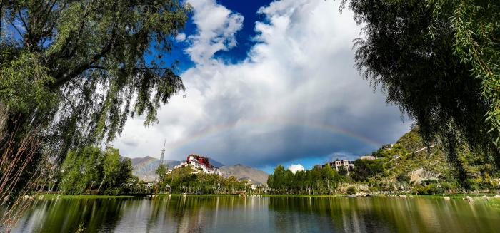 从拉萨团结公园远眺彩虹下的布达拉宫(9月21日摄)。