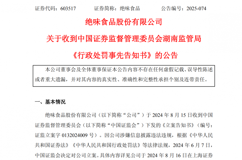9月19日晚间,绝味食品发布公告称,因涉嫌信息披露违法违规,去年6月7日,中国证监会决定对绝味食品立案。今年9月19日,公司收到中国证监会湖南监管局下发的《行政处罚事先告知书》。