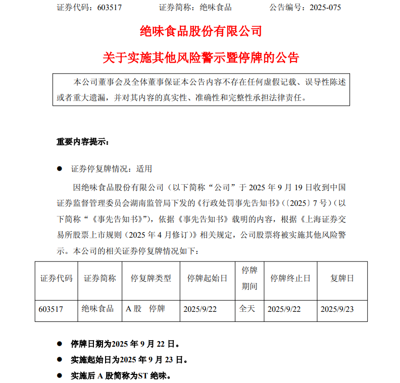同日,绝味食品发布公告称,公司股票将被实施其他风险警示,9月22日全天停牌,9月23日复牌后简称变更为“ST绝味”,日涨跌幅限制缩至5%。