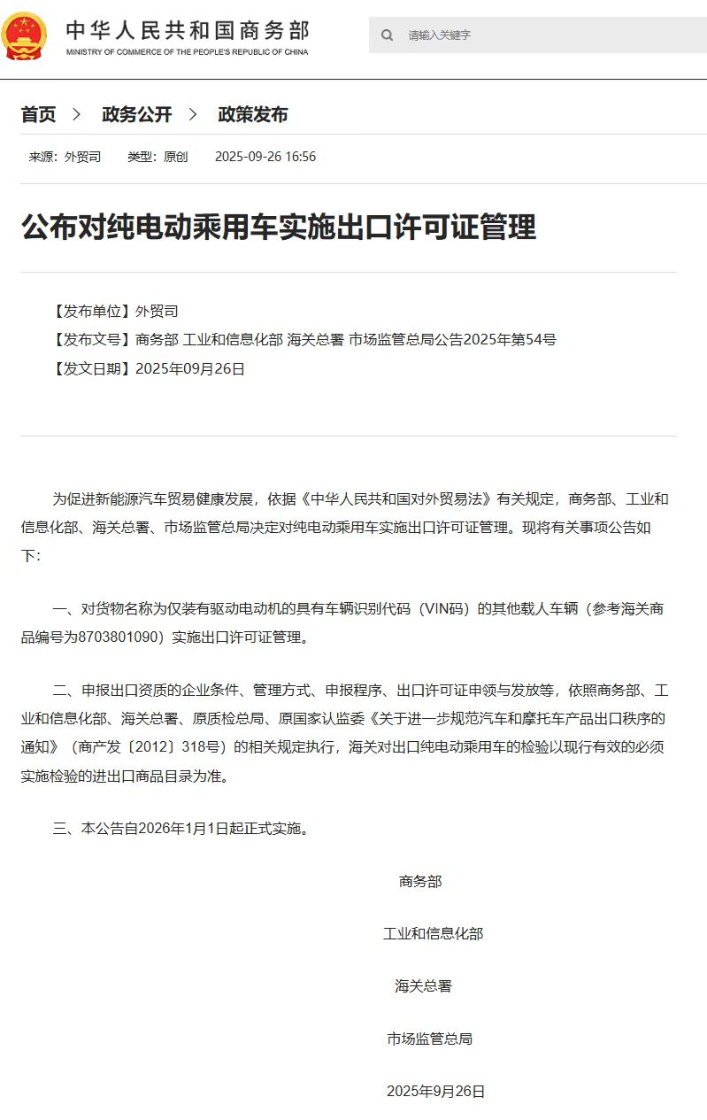9月26日,商务部、工业和信息化部、海关总署、市场监管总局等四部门发布公告称,决定对纯电动乘用车实施出口许可证管理。公告自2026年1月1日起正式实施。