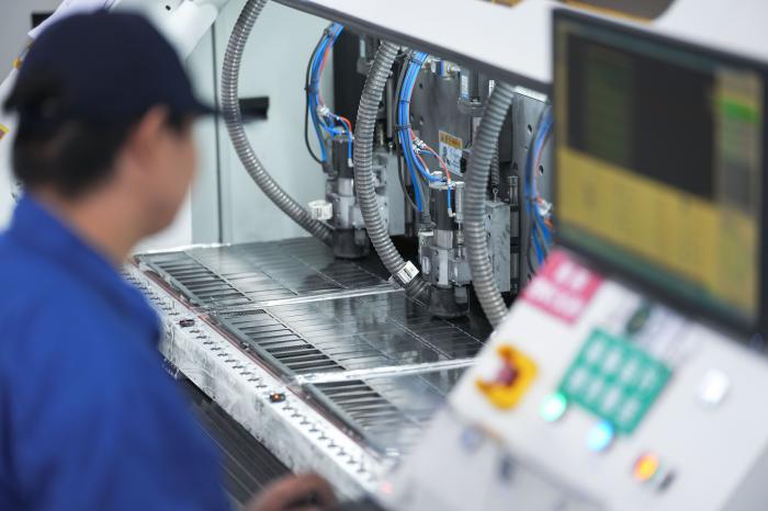 工作人员在吉林化纤集团国兴复材有限公司车间检查雕刻后的碳纤维复材制件(9月17日摄)。新华社记者 颜麟蕴 摄
