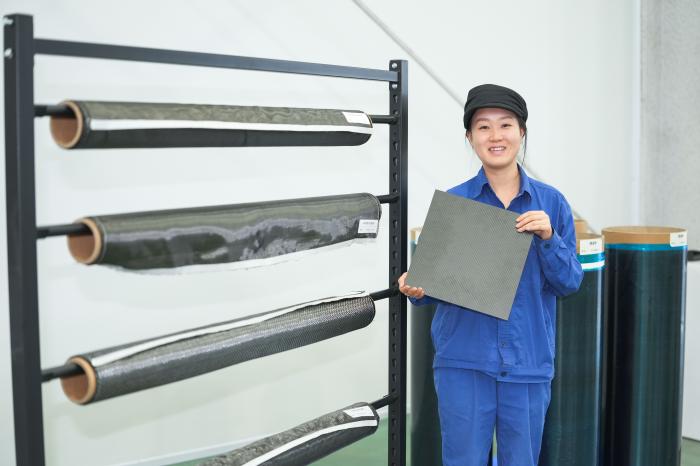 随着国家对新材料产业的重视以及低空经济、新能源汽车等领域的飞速发展,市场对高性能碳纤维复合材料的需求爆发式增长,对制作工艺的精密度和稳定性也提出了更高要求。鲍雨彤在吉林化纤集团国兴复材有限公司车间内展示制成的碳纤维板材(9月17日摄)。新华社记者 许畅 摄