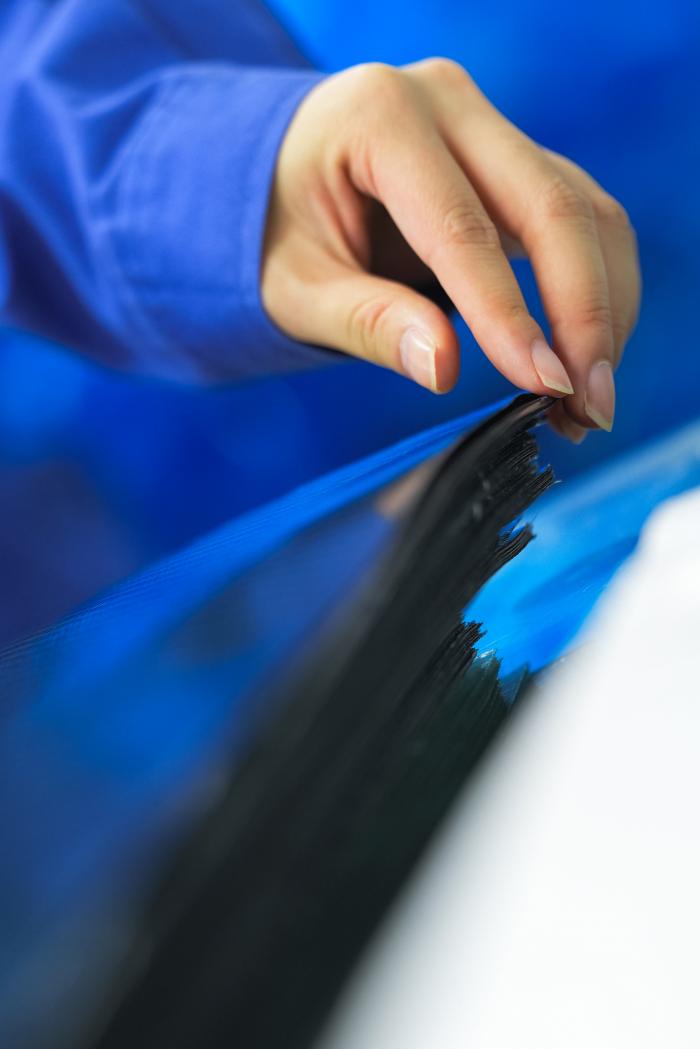 鲍雨彤介绍,要制造出一块符合特定性能要求的碳纤维板材并非易事,需要根据产品设计图纸和力学性能要求,“量身定制”铺层方案。铺贴时,必须保证每一层丝束方向准确、张力均匀、结合紧密。完成后,还需对其进行高温高压固化成型,并通过严格的指标检测,最终才能交付使用。鲍雨彤在吉林化纤集团国兴复材有限公司车间进行碳纤维层压板铺贴工作(9月17日摄)。新华社记者 许畅 摄