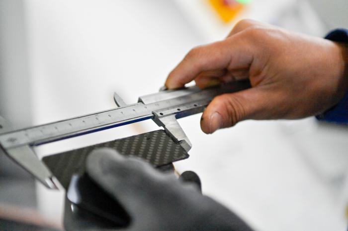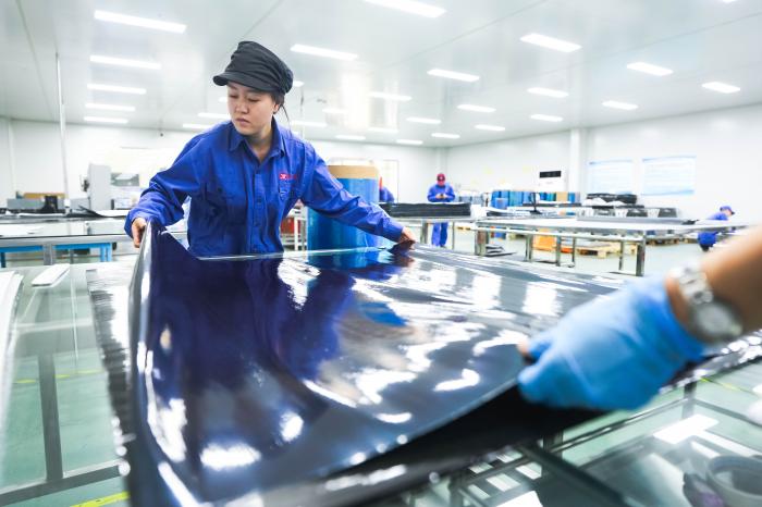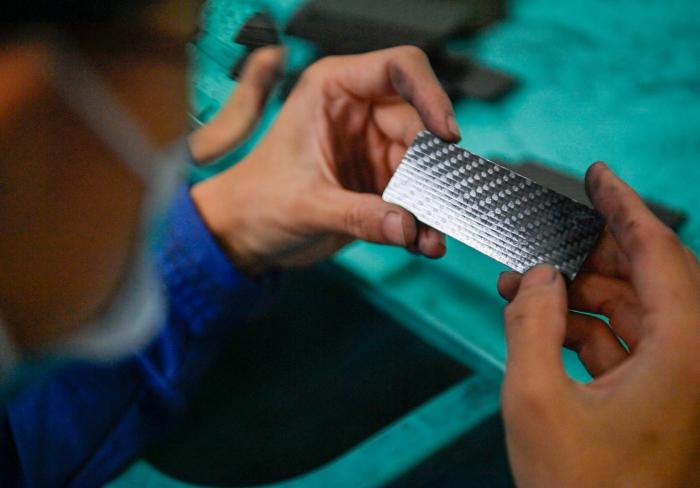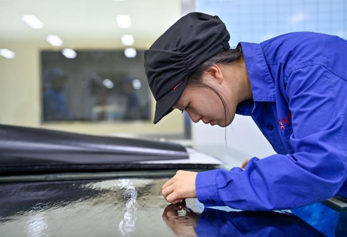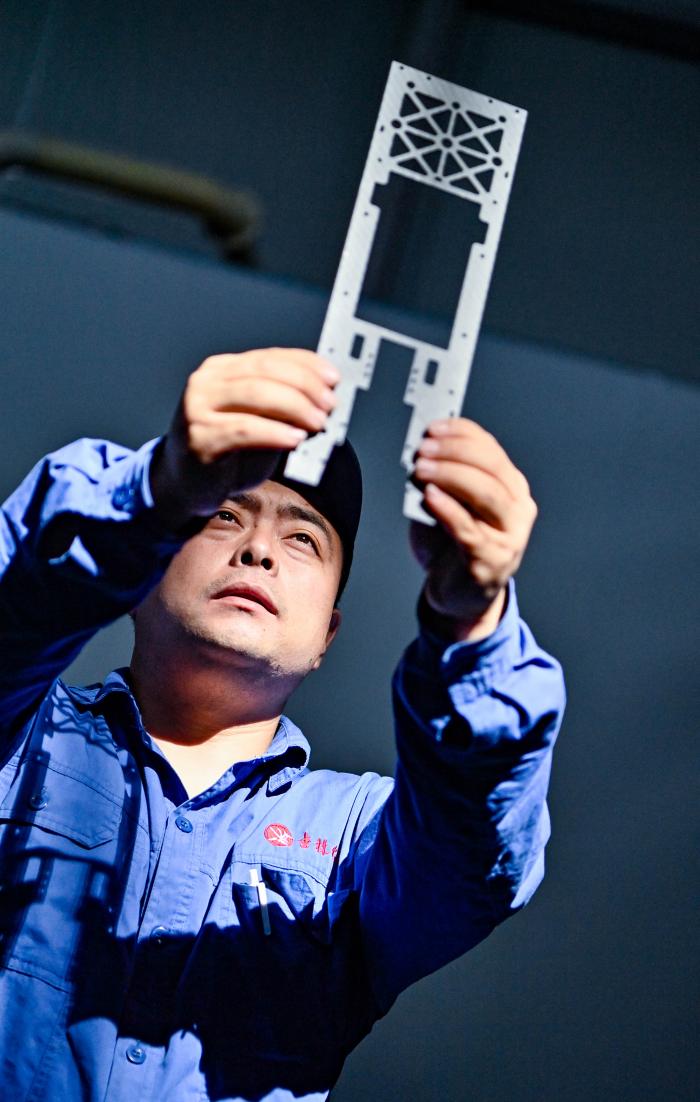 近年来,我国碳纤维产业规模持续快速增长,市场需求旺盛。从原丝生产、碳化到复合材料设计、铺贴制造,职业分工愈发精细化和专业化。产业的蓬勃发展和国家政策的强力支撑,为像鲍雨彤这样的年轻人提供了崭新的职业赛道和成长机遇。轻量化车间高级主管郑铎在检查碳纤维复材制件(9月17日摄)。新华社记者 颜麟蕴 摄