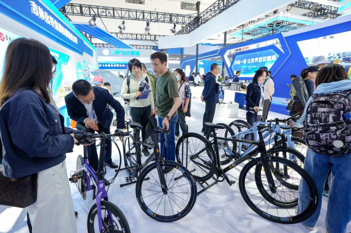 参观者在第十一届空军航空开放活动和长春航空展现场参观吉林化纤展出的碳纤维自行车(9月20日摄)。新华社记者 许畅 摄