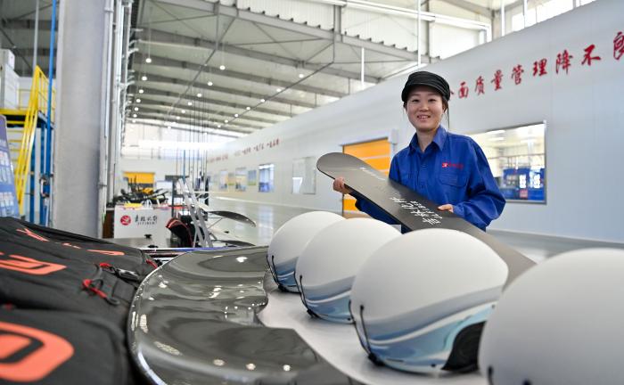 鲍雨彤在吉林化纤集团国兴复材有限公司内展示碳纤维制作的雪板和头盔(9月17日摄)。新华社记者 颜麟蕴 摄