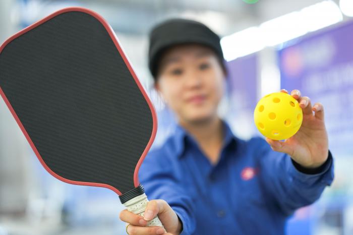 鲍雨彤展示利用碳纤维制作的球拍(9月17日摄)。新华社记者 许畅 摄