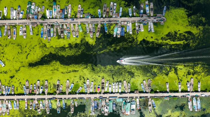 9月26日,捕蟹船只回到阳澄湖码头(无人机照片)。新华社发(王须中摄)