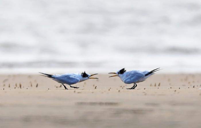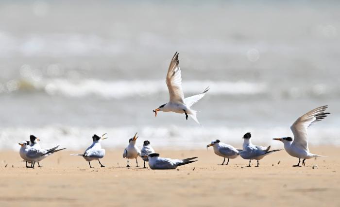 近日,在山东省日照市刘家湾赶海园,被誉为“神话之鸟”的国家一级保护动物中华凤头燕鸥在滩涂上嬉戏、觅食、栖息,尽显自然生机与生态之美。
