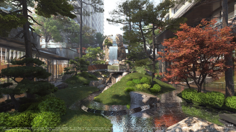 景观上,璞樾提出“当代兰亭·一里世界隐园”,打造了千米水系贯穿的风雅疗愈意境,营造可游、可赏、可居的园林体系。整体景观对标三家世界隐奢酒店,如丽兹卡尔顿隐世般静谧,延续六善的慢生活,承袭安缦的宁静哲学,把疗愈体验融入CBD核心。