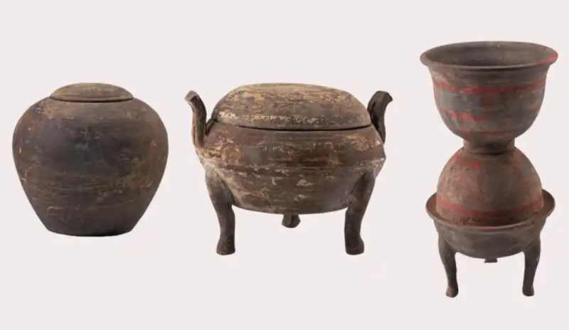 赵康村墓葬共出土器物76件,质地有陶、铜、石、铁等。所出器物,尤其是陶器,以仿铜礼器为主要组合方式,且器物皆放置于墓主人头部或头部一侧专设的耳室中,体现了战国以来传统葬制的延续。所出器物整体矮圆,流行装饰彩绘云气纹等,均为西汉前期的风格,且不见西汉中期以后流行的井、灶、仓。