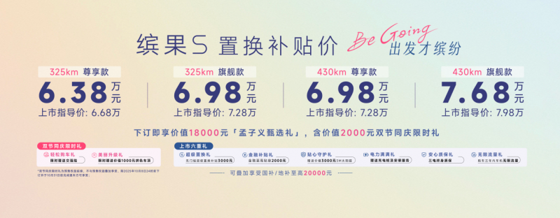 缤果S共推出325km尊享款、325km旗舰款、430km尊享款、430km旗舰款四款配置,上市指导价为6.68万-7.98万元,叠加置换政策可享置换补贴价6.38万-7.68万元,更可叠加享受至高20,000元的国家/地方购车补贴。